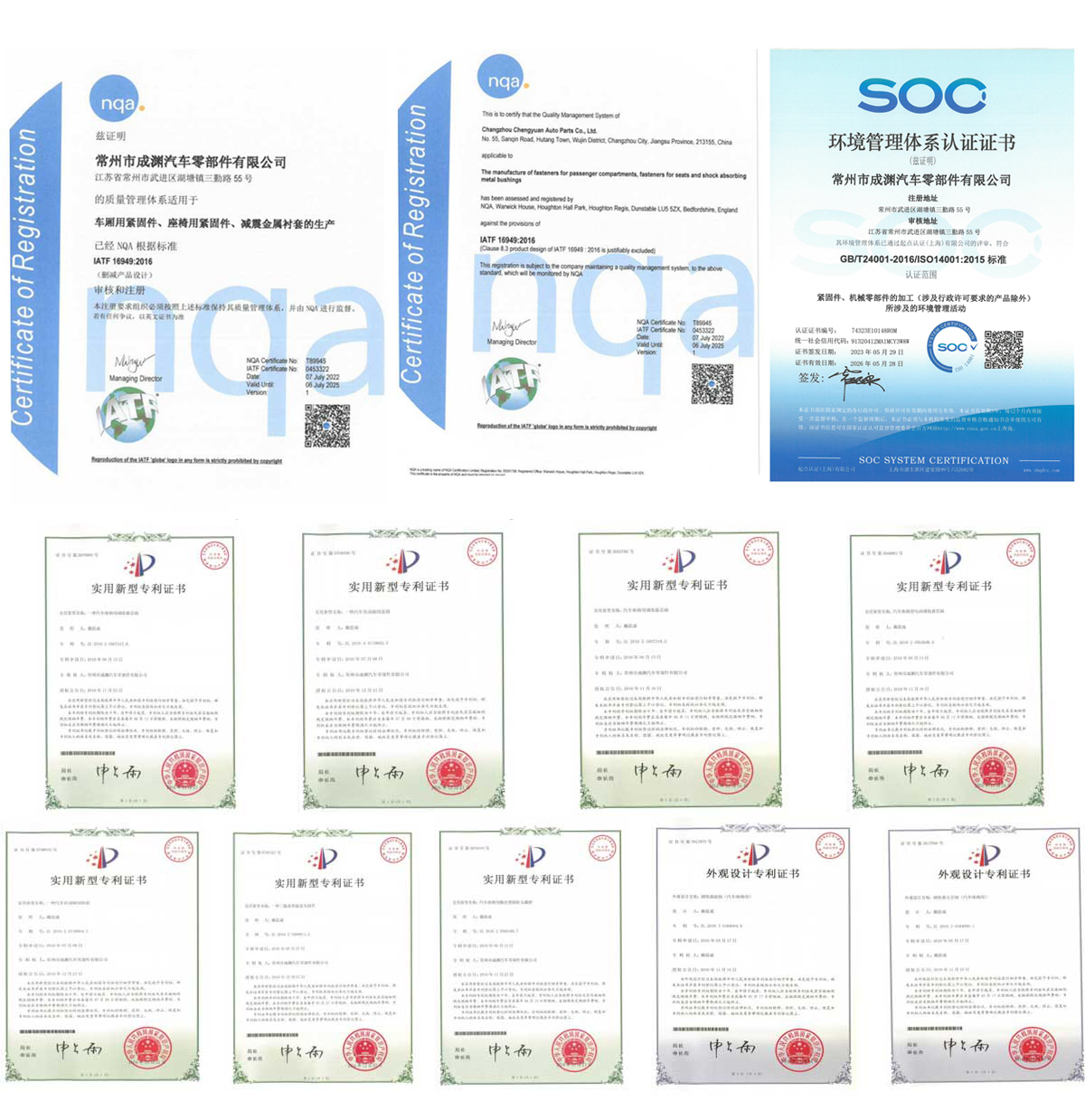 我司通过了IATF16949:2016体系认证、环境管理体系认证及7项实用新型专利证书,2项外观设计专利证书。主要生产设备包含:冷镦机、CNC加工中心、数控车床、数控铣床、数控磨床等;检测设备包含:投影仪、硬度计、粗糙仪、偏摆仪、拉力试验机、轮廓仪、盐雾试验箱等 。